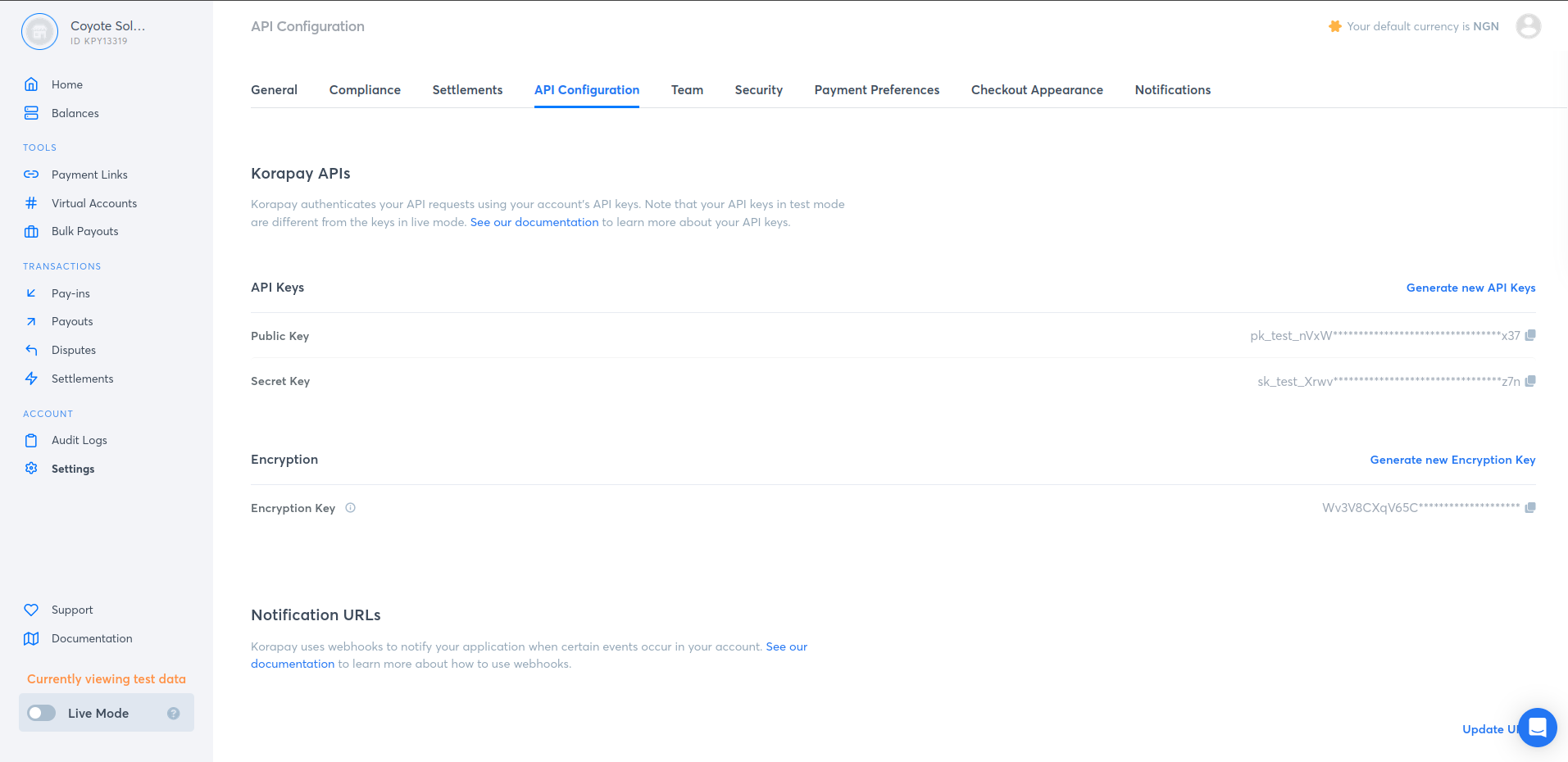 Your korapay credentials like your public key, secret key and encryption are available to you after creating an account with Korapay. Log in to your korapay dashbord, in your settings page, go to the API Configuration tab. click on the image below to zoom.